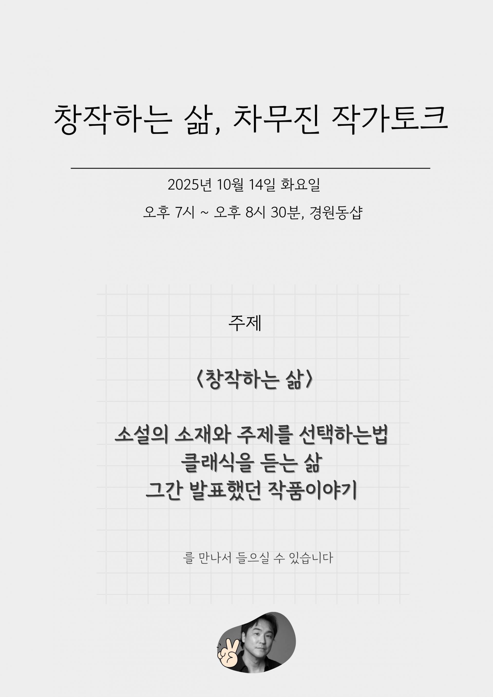 문의처 : 경원동샵 010-5806-1570 * 온라인 예약이 어려운경우, 경원동샵에 차무진작가 토크 신청한다고 문자만 남겨주셔도 예약이 완료됩니다 😉 |
